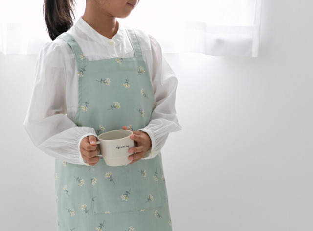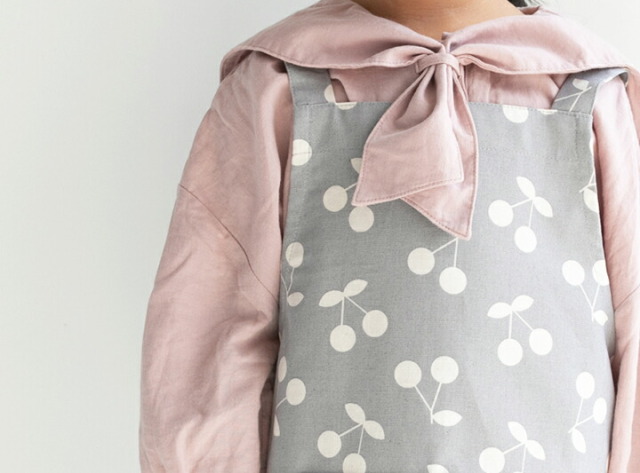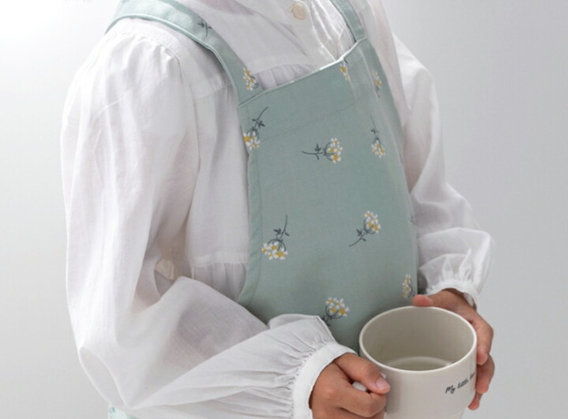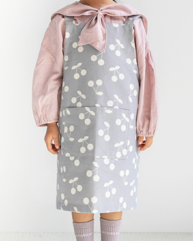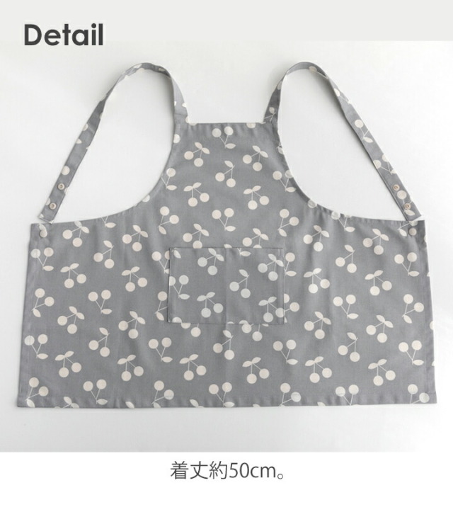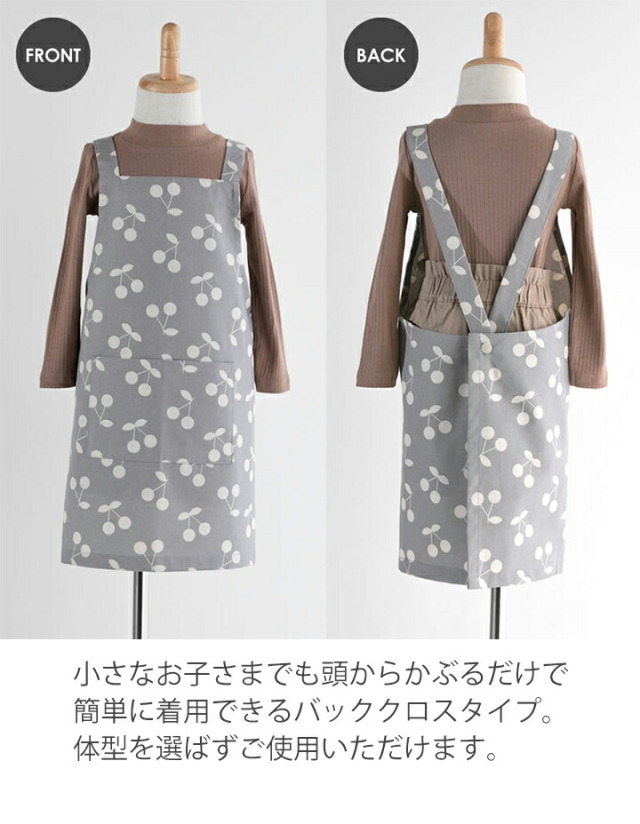 バッククロスタイプのエプロンで、小さなお子さまでも頭からかぶるだけで着用できます。