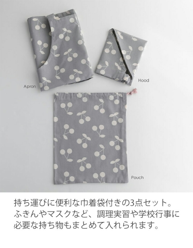 100~120cmサイズ(園児~小学校低学年向け)のエプロン・三角巾・巾着袋の3点セットです。