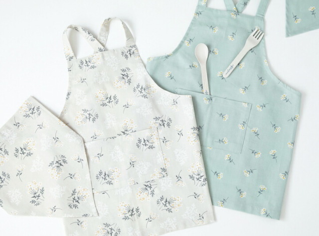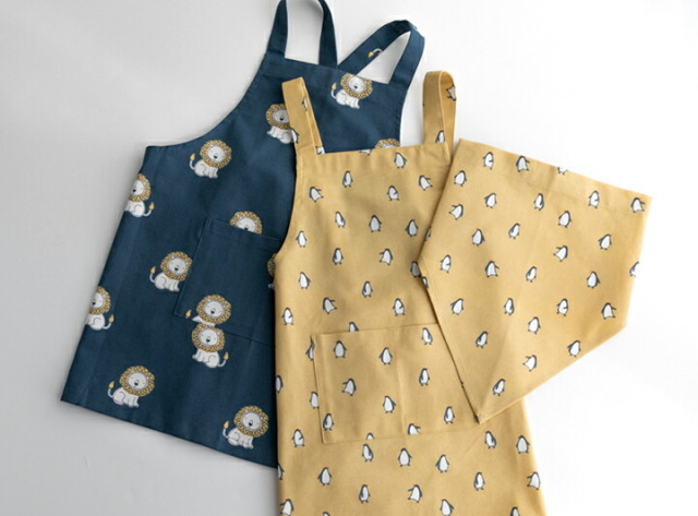 当店の姉妹店でもある手芸ショップ「デコレクションズ」の人気オリジナル生地を使用したキッズ用のエプロンセット。