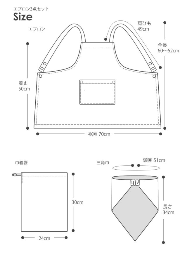 Sサイズ 100~120cmサイズ(園児~小学校低学年向け) エプロン 全長:約60~62cm(スナップボタンにより2段階調節可能) 着丈:約50cm 裾幅:約70cm 肩ひも長さ:約49cm 三角巾 頭囲:約51cm 長さ:約34cm 巾着袋(マチなし) 高さ:約30cm 幅:約24cm |