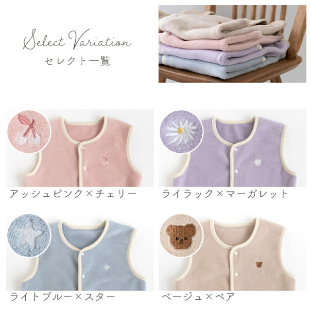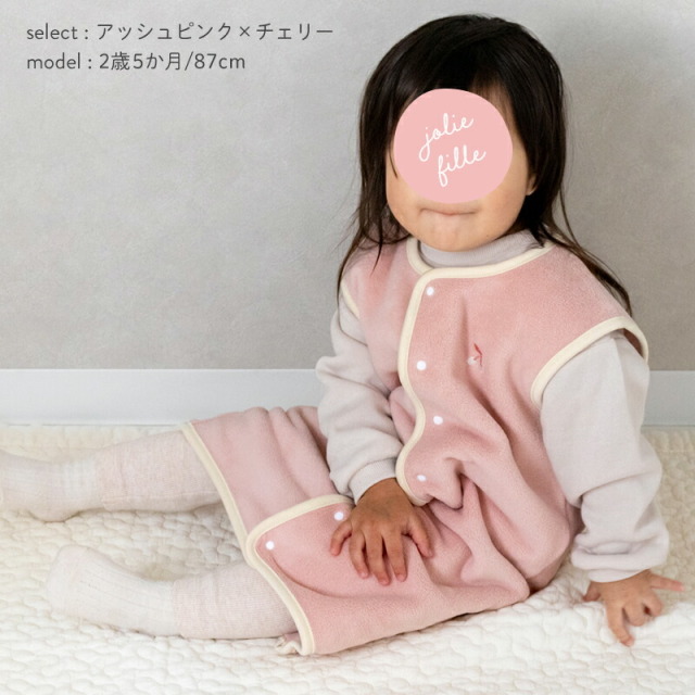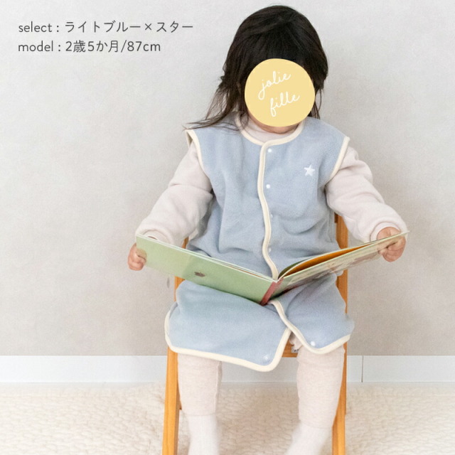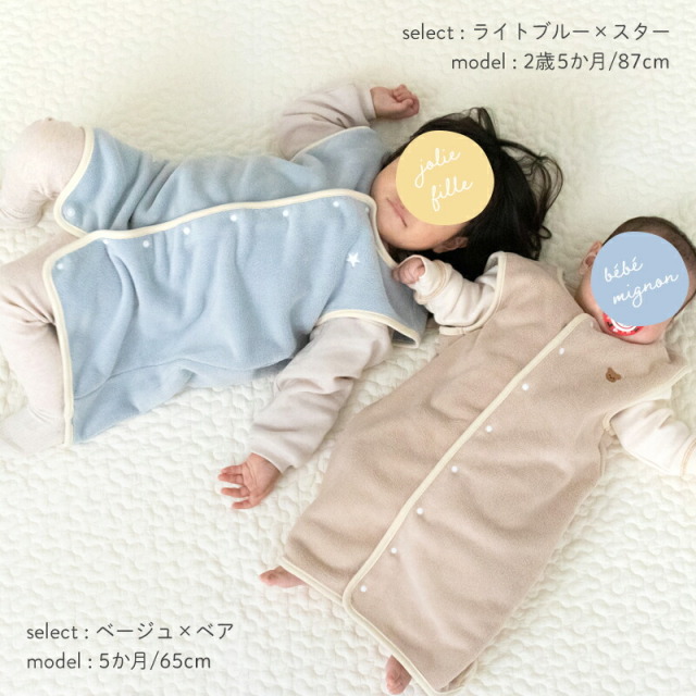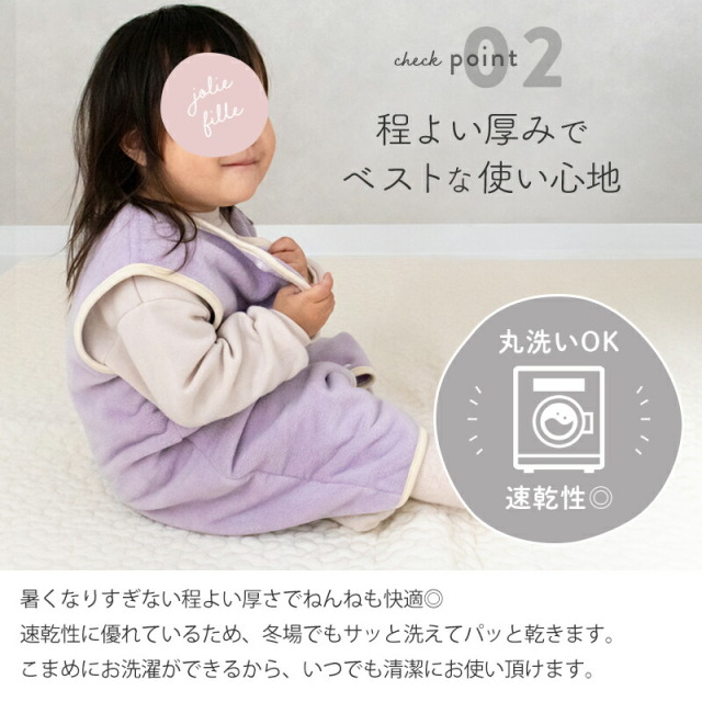薄くて軽く、保温力に定評のあるマイクロフリースを使用。マシュマロみたいにふんわりと柔らかく、思わず頬ずりしたくなるやさしい肌触りです。伸縮性のある生地で動きやすく、元気なベビーやキッズにぴったり。