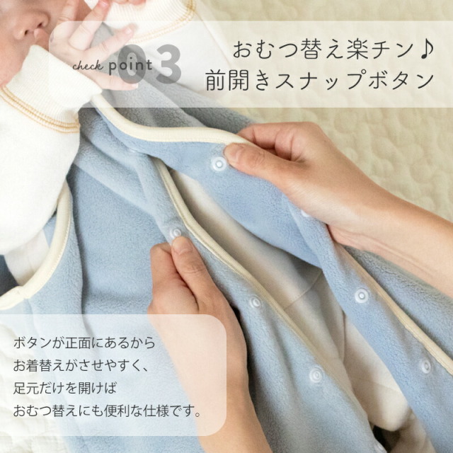スナップボタンで留める前開きタイプなので、お着替えをさせやすく、足元だけをサッと開けばおむつ替えも簡単に行えます。