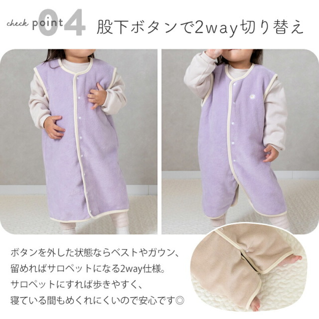 ロンパースタイプは歩きやすく、寝ている間に動き回ってもめくれ上がる心配がないので安心です。