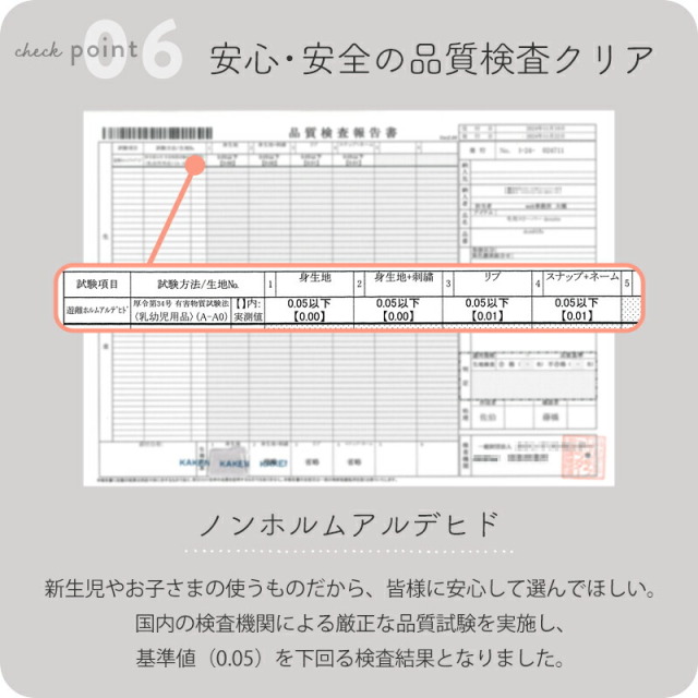 当店の製品は、国内の検査機関による厳正な品質試験をクリアしているため、新生児から安心してお選びいただけます。