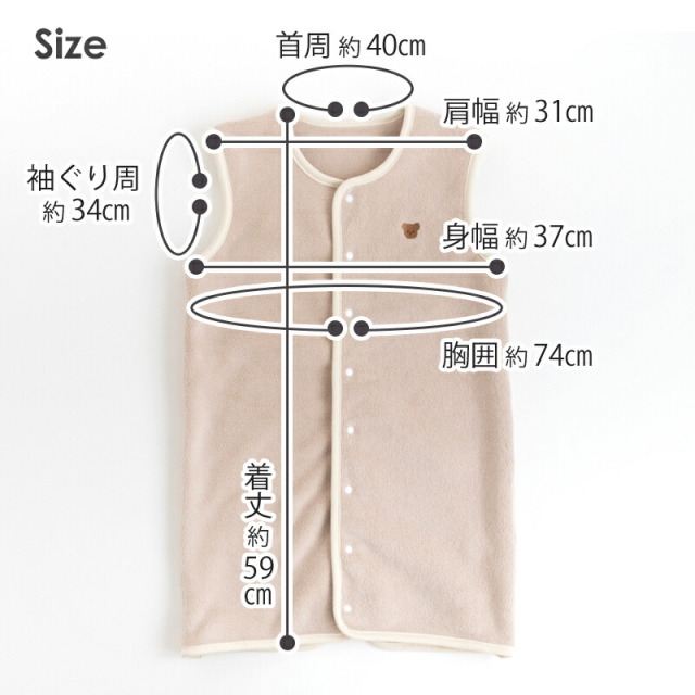 80~100cm(0~3歳頃まで) 着丈:59cm/肩幅:31cm/身幅:37cm/胸囲:74cm 首周:40cm/袖ぐり周/34cm |