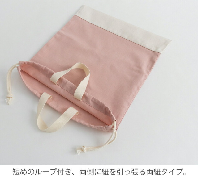 一番大きい巾着Lサイズは、短めのループを取り付け、フックなどに引っかけた時に床につきにくい設計になっています。