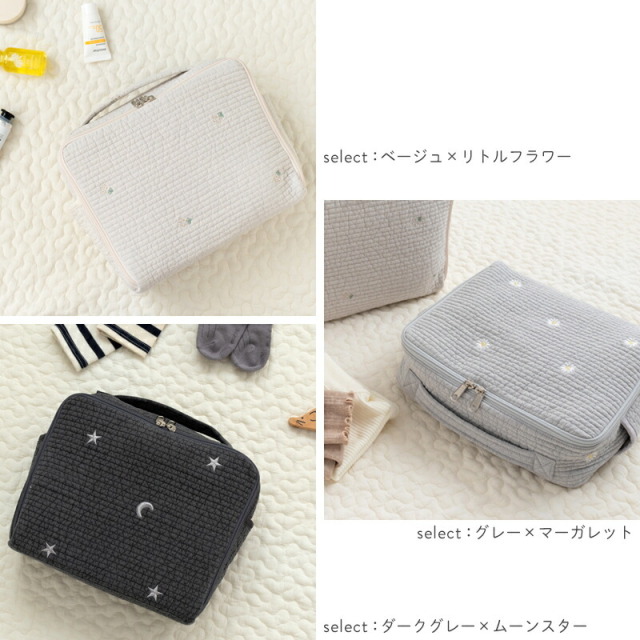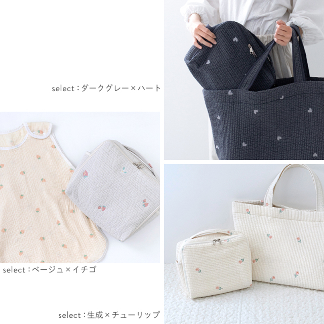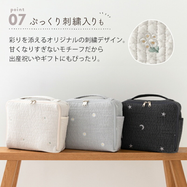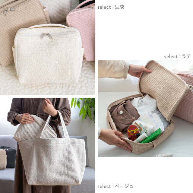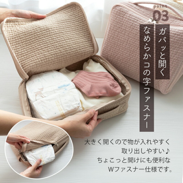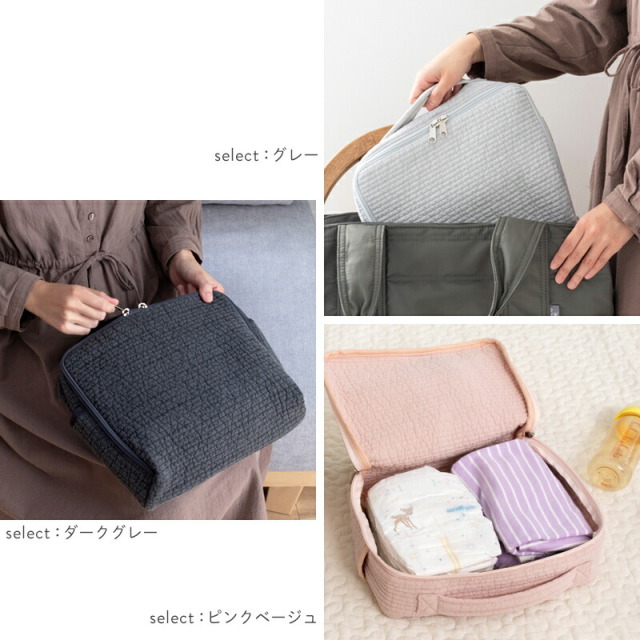 おむつ入れはもちろん、出産時の入院ポーチや、下着・スキンケア用品を入れるトラベルポーチとして、マルチにお使いいただけます。