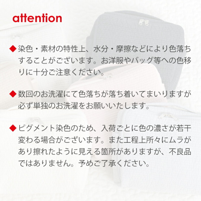 ・お洗濯は洗濯ネットや中性洗剤を使用して手洗いかドライコースで洗濯することをお勧めします。 ・ヌビ生地は、染色・素材の特性上、水分・摩擦などにより色落ちすることがございます。お洋服や他バッグ等への色移りに十分ご注意下さい。 ・数回のお洗濯にて、色落ちが落ち着いてまいりますが、必ず単独のお洗濯をお願いします。 ・漂白剤は使用しないでください。 ・長時間、水につけ置きしないでください。 ・お洗濯の際に多少形が崩れたり、生地が縮むことがございます。 ・直射日光を避けて日陰で乾燥させてください。乾燥機は使用しないでください。 |