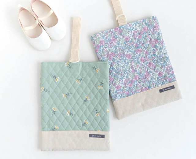 当店の姉妹店でもある手芸ショップ「デコレクションズ」の人気オリジナル生地を使用したシューズバッグ。
