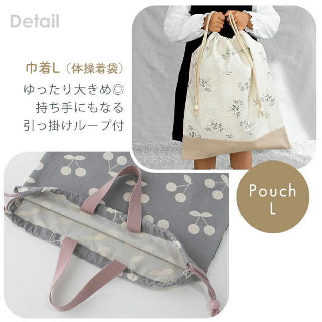 【レッスンバッグ】 幅:約40cm×高さ:約30cm 持ち手(高さ):約13cm ループ(高さ):約5cm 内ポケット:縦約15cm×横約20cm 【シューズケース】 幅:約22cm×高さ:約29cm 持ち手(高さ):約15cm 【巾着L】 幅:約30cm×高さ:約38cm ループ(高さ):約9cm マチなし 【巾着M】 幅:約30cm、底幅:約17.5cm、高さ:約19.5cm、マチ:約12cm 【巾着S】 幅:約19.5cm、底幅:約12cm、高さ:約20cm、マチ:約7.5cm |