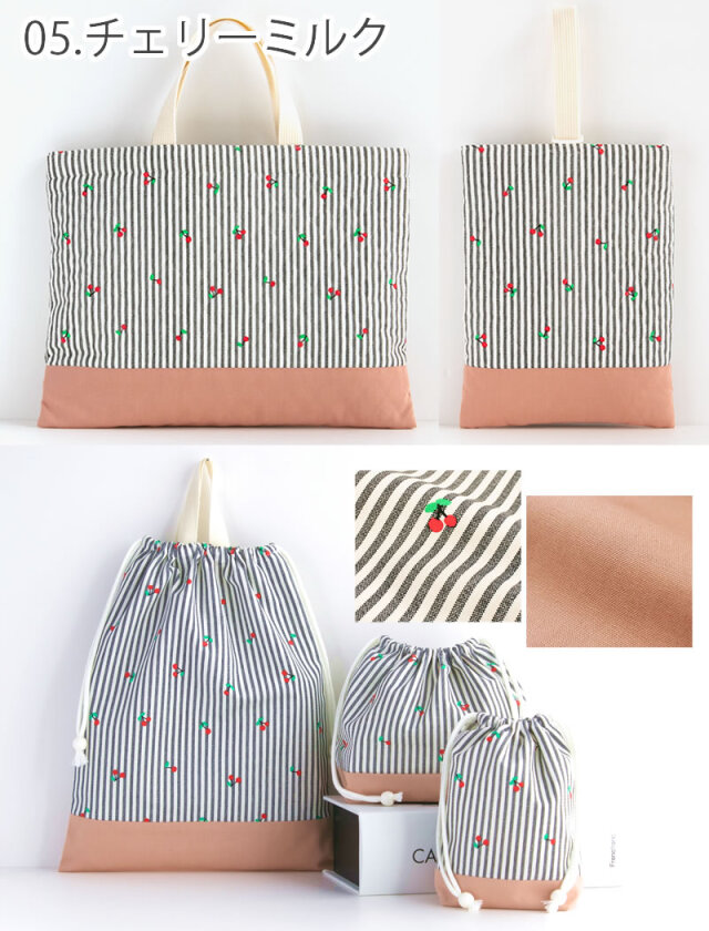 当店の姉妹店でもある手芸ショップ「デコレクションズ」の人気オリジナル生地を使用した入園入学5点セット。