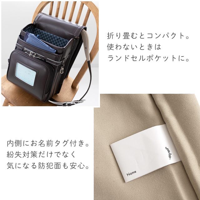軽量で柔らかいので使わないときはコンパクトに折りたたみ、ランドセルや通学バッグのポケットにもすっきり収納できます。