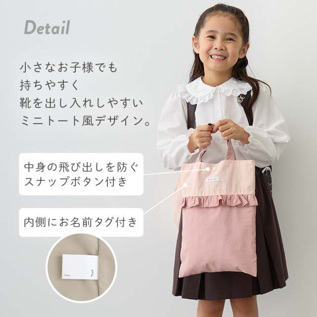 小さなお子さまでも持ちやすいミニトート風デザインで、靴の出し入れもスムーズ。