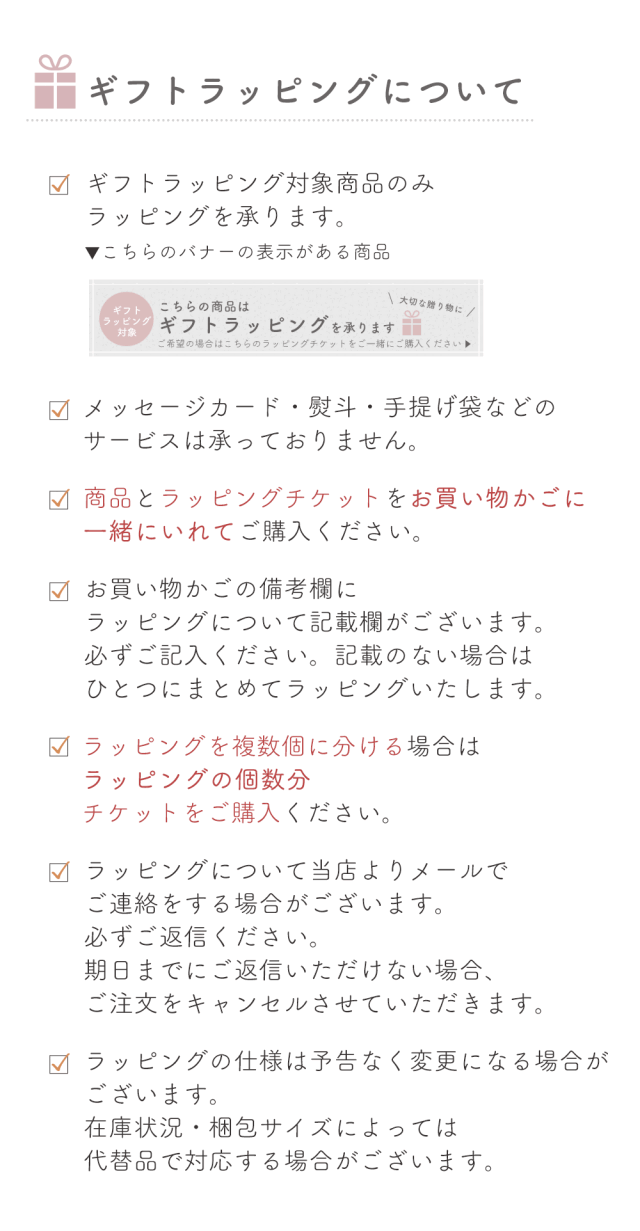 ・ギフトラッピング対象商品のみラッピングを承ります。 ≫ 対象商品はこちら ・メッセージカード・熨斗・手提げ袋などのサービスは承っておりません。 ・商品とラッピングチケットをお買い物かごに一緒にいれてご購入ください。 ・お買い物かごの備考欄にラッピングについて記載欄がございます。必ずご記入ください。記載のない場合はひとつにまとめてラッピングいたします。 ・ラッピングを複数個に分ける場合は、ラッピングの個数分チケットをご購入ください。 ・ラッピングについて当店よりメールでご連絡をする場合がございます。必ずご返信ください。 期日までにご返信いただけない場合、ご注文をキャンセルさせていただきます。 ・ラッピングの仕様は予告なく変更になる場合がございます。在庫状況・梱包サイズによっては代替品で対応する場合がございます。 |